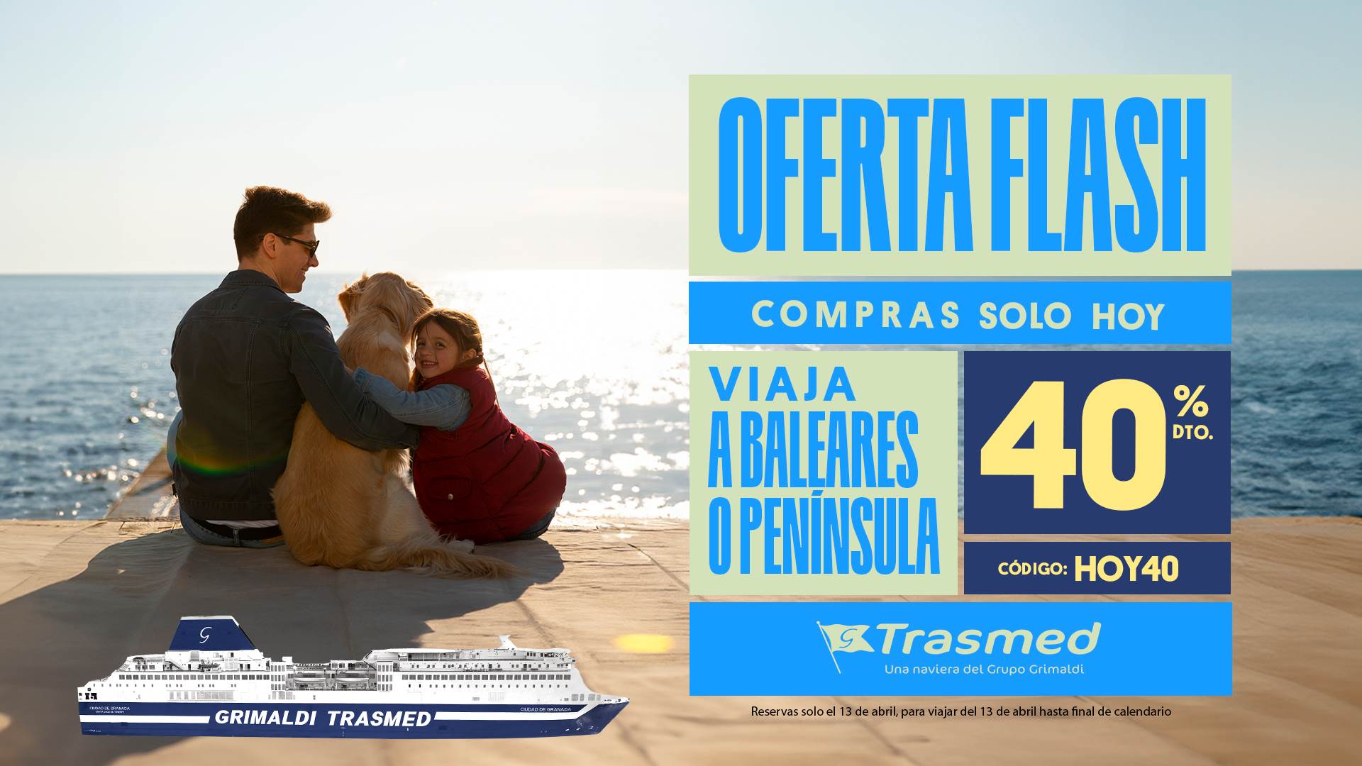 Oferta disponible para todas las rutas de TRASMED. No válido para billete combinado con Trasmapi ni para rutas operadas por Menorca Lines. Reservas solo el 13 de abril, para viajar del 13 de abril hasta final de calendario. La oferta prevé un descuento del 40% de descuento sobre el precio de la tarifa (incluyendo camarote, butaca, vehículos y/o mascotas) excepto tasas. El descuento se aplica en reservas tanto de ida como de ida y vuelta para un máximo de hasta 4 pasajeros. Para poder obtener el descuento se deberá introducir el código promocional HOY40 durante la fase de reserva. La flexibilidad de la promoción dependerá de la tarifa seleccionada en el proceso de reserva. No válido para salidas en el mismo día. El descuento se aplicará sobre la tarifa comercial previa a la aplicación de las bonificaciones oficiales. La oferta no es válida en los billetes “open” o con vuelta abierta. Esta promoción no tiene efecto retroactivo (es válida para nuevos billetes y no se aplica para billetes emitidos antes del inicio de la oferta) y está sujeta a disponibilidad de plazas y a condiciones generales de venta. Reserva en taquillas en los puertos, en nuestra página web, la APP, en tu agencia de viajes o a través del teléfono de atención al cliente (96 091 33 16).